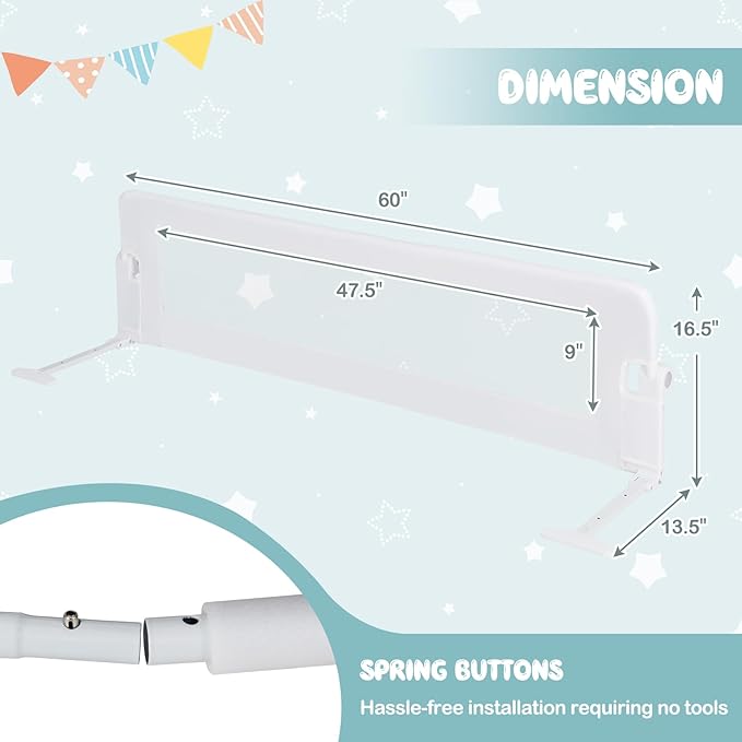 - [ Protect Your Baby's Safety ]: This extra-long bedrail is 59 inches long for added safety. When your kids sleep alone at night, it can provide them with the best protection and safe sleeping environment. It is your kid's safety guard, so you don't have to worry about your baby falling off the bed.