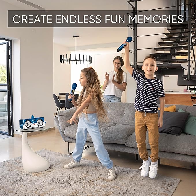 - 【Some-fin special】- It’s a magic sing-along for every fiesta on the best karaoke machine for kids! The powered 15-watt Bluetooth speaker with microphone set doubles as a portable PA system with wireless mic (actually, two mics)! A perfect birthday gift for boys & girls.