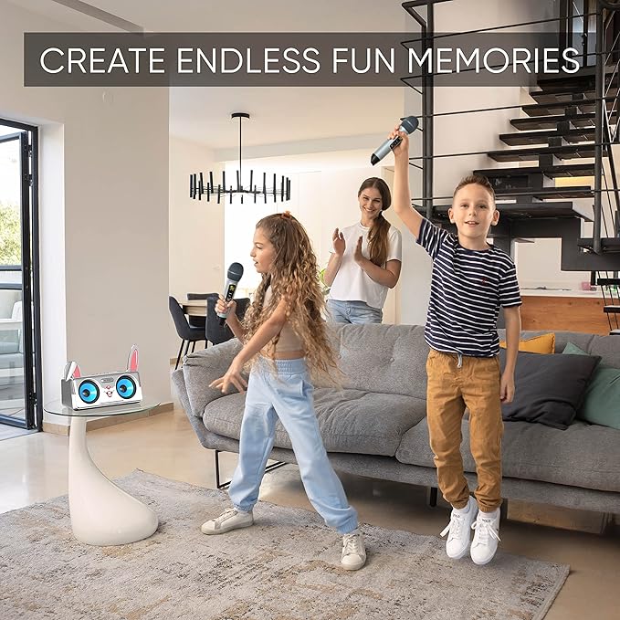- 【No bunny but you】 - It’s a magic sing-along for every fiesta on the best karaoke machine for kids! The powered 15-watt Bluetooth speaker with microphone set doubles as a portable PA system with wireless mic (actually, two mics). A perfect birthday gift for boys and girls!