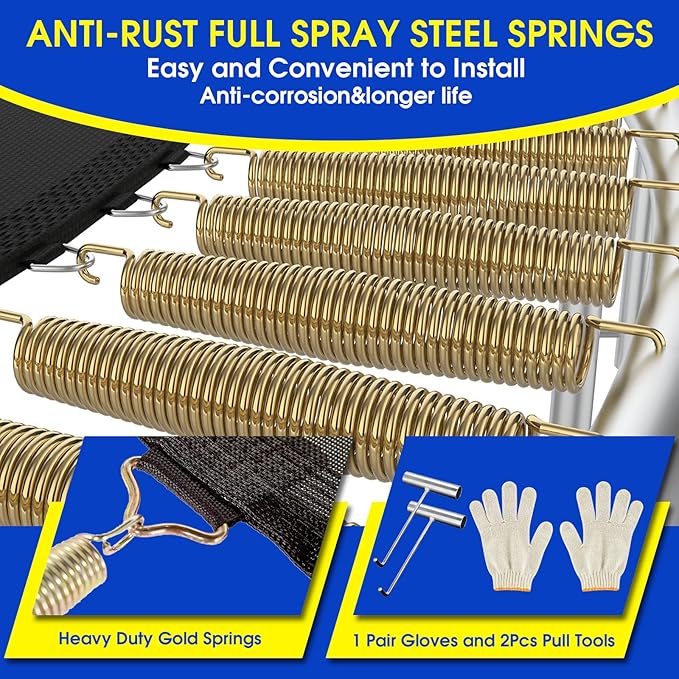 - ๐Upgrade Waterproof Trampoline Material: Added waterproof and anti-UV safety poles foams which can protect the safety poles away being broken, and extend the lifetime of the trampoline. PP spring pad and high-strength woven jumping mat are also waterproof. Extra including 4 set trampoline wind stakes. Greatly reducing the risk of trampolines being broken in bad weather. Reducing your economic loss.