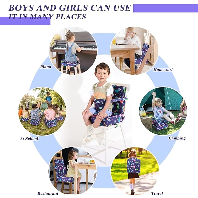 - [Perfect size] The portable booster seat has a backrest size of 14.1 x 12.6 x 1.57 inches and a cushion size of 14.1 x 12.6 x 4 inches, making our kids booster seat suitable for most dining chairs. We have also increased the length of the bottom seat belt to better secure the seat cushion to the chair. Note: Due to packaging compression, the product will return to its original height within 24-48 hours after opening
