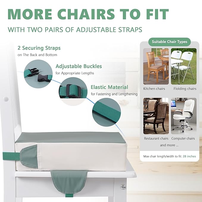 - 【Safety & Anti-slip】The booster seat for table features anti-slip particles and reinforced straps. The anti-slip particles provide excellent resistance to prevent the seat from sliding on the surface of the chair. This ensures your baby stays firmly in place while sitting. The straps add an extra layer of safety, keeping the seat securely fixed to the chair and minimizing the risk of movement. Your baby will be very safe and stable during mealtime or any other activity at the kitchen table.