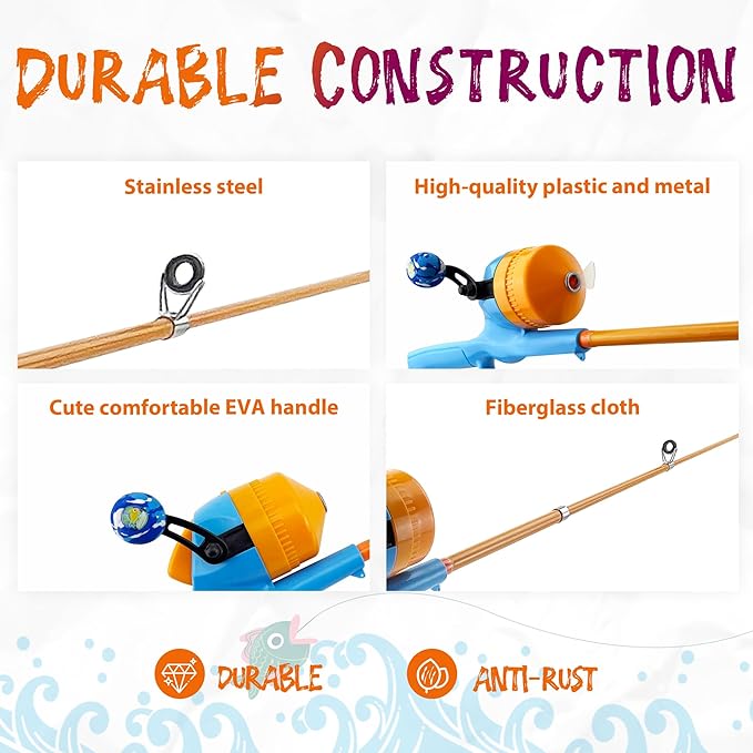 - Durable Construction: Our fishing rod's guide eyes use stainless steel instead of iron to make them less rusty. The fishing spin-cast reel with high-quality plastic and metal, which is more durable. The four-layer fiberglass cloth makes the fishing rod have better toughness and is not easy to break and rust, and it is also beneficial to the safety of children