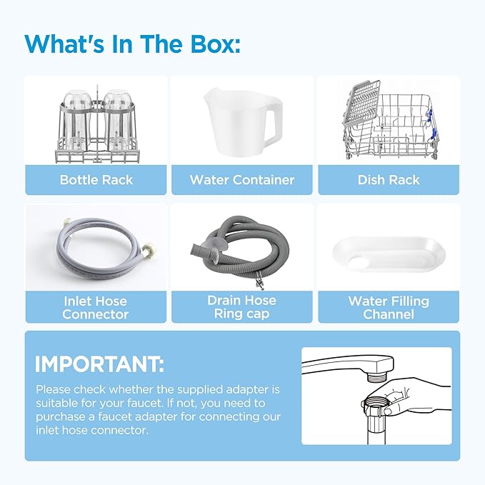 - BABY CARE FUNCTION -- A new version of the dishwasher with improved cleaning power, designed specifically for baby products and gives a sparkling clean. With a baby bottle holder included—which ensures that bottles stand upside down in an organized way and that pacifiers won’t get tossed around by water during washing—this product is perfect for cleaning baby bottles and pacifiers, providing special care for your baby.