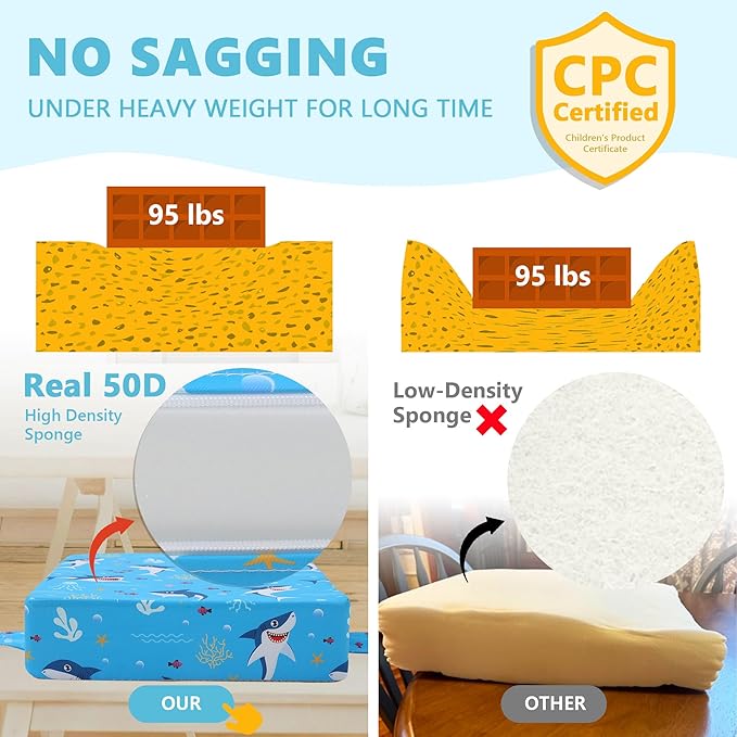 - 【REAL 50D Sponge, ZERO Sagging】The Booster Seat from Sylynvia Brand is of REAL 50D high-density sponge, which ensures softness and comfort while being able to withstand a weight of 80 pounds and will not sag when sitting for a long time, providing excellent support.This means that it has a long service life and your baby can use it from the age of 1 to 8 years old.