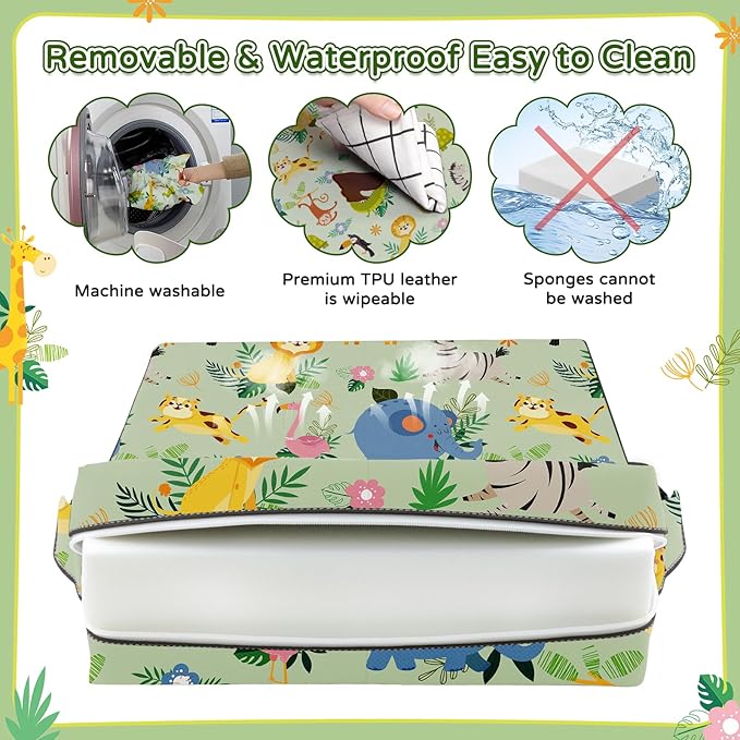 - 【Waterproof and easy to clean】: The toddler booster seat for table cover is a high-elastic TPU film that is waterproof, spill-proof, wear-resistant, and stain-resistant. It protects the sponge from moisture and is more durable than ordinary PU leather. Daily cleaning only requires wiping with a rag or baby wipes. The kids booster seat cover adopts a zipper design, which can be detached and separated from the TPU chair cover and the internal sponge, and supports machine washing or hand washing. (The washing water temperature is lower than 45°, and the sponge does not need to be washed)