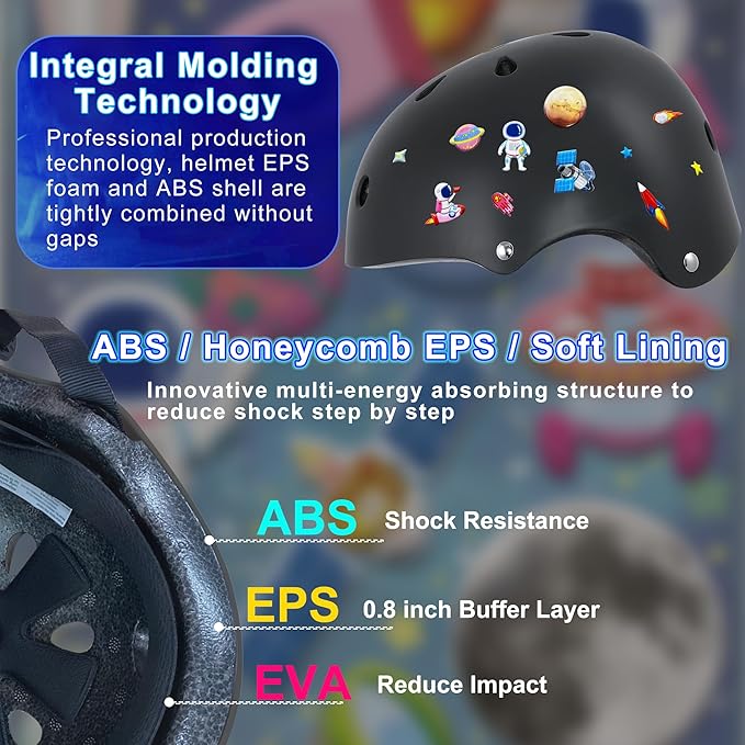 - 【Unique DIY Kids Helmet】 Toddler youth helmet included space themed stickers, your kids can enjoy and use their imagination to create their own customized bicycle helmet. With knee pads and elbow pads set, effectively protects your kids from injuries during multi-sports, not only protects the baby but also delights the mood. The designed bicycle helmet is a great gift for kids 8-14 years old. (One sticker picture will be given randomly)