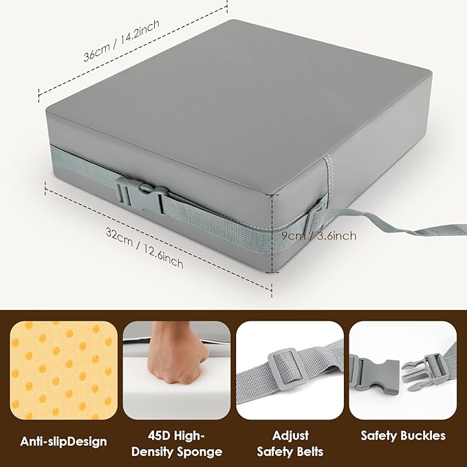- â ăHigh-Density Support Foam - Long-Term Comfortă:Built with a 50D high-density foam, this chair booster seat for toddler 2-12 retains its shape and density even with long-term use,supporting your child well during mealtimes. Whether used as a toddler seat cushion, a kid booster seat for table, or even for floor play, your little one stays comfy and secure.Size:14.2 x 12.6 x 3.6 + 14.2 x 14.2 x 2 inch, total 2 pcs