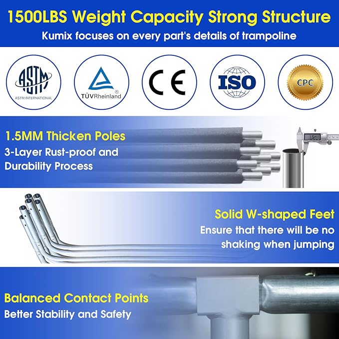 - ๐Focus Every Detailed Point: No-gap design safety inner enclosure net securely and closely attached to the jumping mat all the way around; 1.5mm galvanized steel pipes are treated to prevent rust which is more rust-proof and durable than ordinary steel pipes; 80mm full spray steel springs are stronger, more anti-rust, anti-corrosion and longer life; 4pcs trampoline anchor set can reduce your losses in high wind weather.